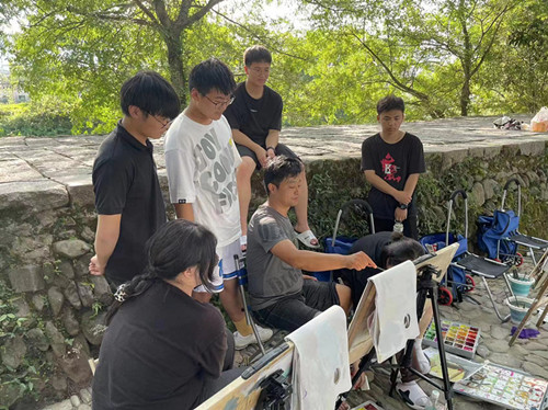 高三級部主任魏振河、副主任郝俊偉深入教學現(xiàn)場了解學生生活及學習情況。班主任谷鵬建、滕中強、楊帆等老師自駕前往基地看望學生,為同學們送去慰問品,濃濃的師生情,讓人感動。帶隊的專業(yè)課教師制定了科學的研學計劃及生活、交通各方面嚴格的規(guī)章制度。美術生在老師的帶領下置身古村落的湖邊巷陌寫生創(chuàng)作,面前的一排排作品組成壯觀的畫廊;音樂生置身高山空谷,在專業(yè)老師的指導下練聲練耳,還游覽秀里影視村,感受《儒林外史》的拍攝情境。整個活動準備充分,帶隊領導不辭辛苦,專業(yè)老師恪盡職守,全體同學嚴于律己,無一起學生安全事故,教學任務圓滿完成。